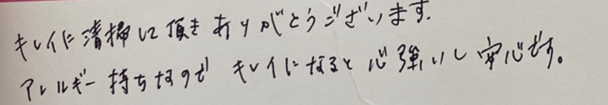 「キレイに清掃して頂きありがとうございます。アレルギー持ちなのでキレイになると心強いし安心です。」