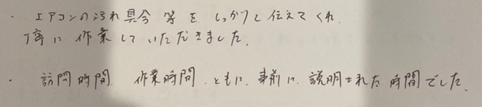 「・エアコンの汚れ具合等をしっかりと伝えてくれ、丁寧に作業していただきました。