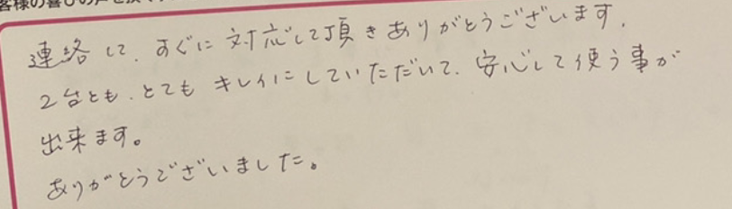 「連絡してすぐに対応して頂きありがとうございます。2台とも、とてもキレイにしていただいて、安心して使う事が出来ます。ありがとうございました。」