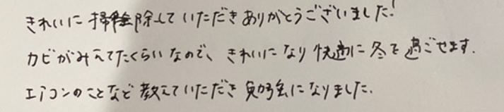 「きれいに掃除していただきありがとうございました!カビがみえてたくらいなので、きれいになり快適に冬を過ごせます。エアコンのことなど教えていただき勉強になりました。」